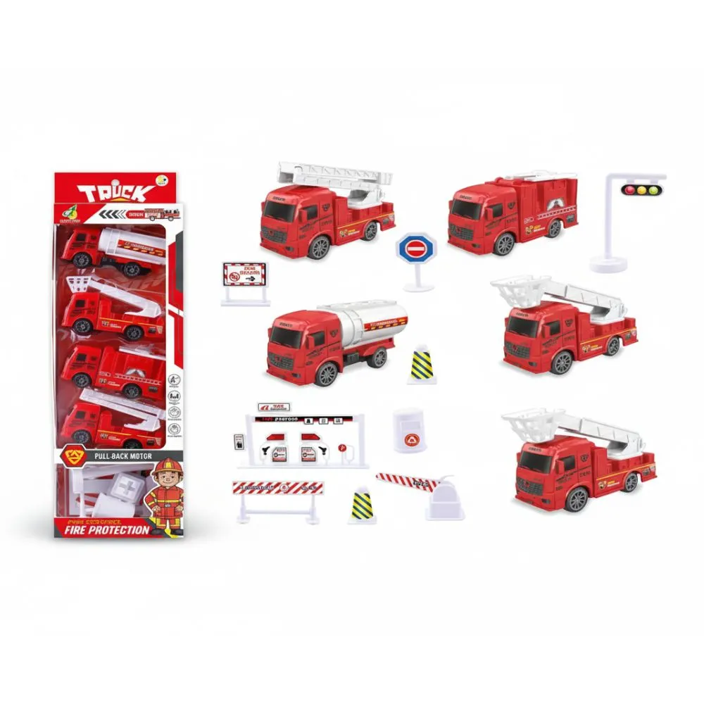 4pcs Pullback Fire Trucks Set with Road Signs for Kids